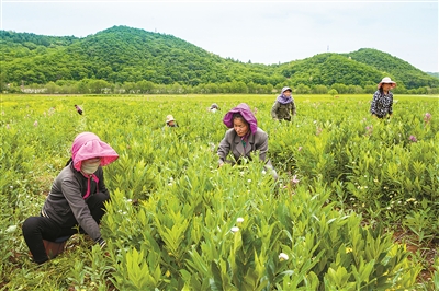 丹东市宽甸县青椅山镇碱厂村药用芍药、八股牛竞相绽放,林农在鲜花丛中除草