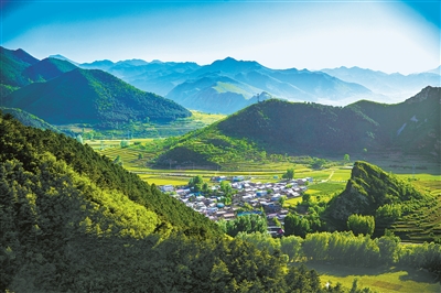 林改后,朝阳凌源市以封山育林为主,生态环境得到极大改善,绿色乡村比比皆是。图为群山环绕的凌源市河坎子村
