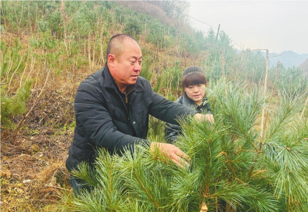 桓仁县沙尖子镇北沟村党支部书记刘永君(左)查看红松和林下刺嫩芽的生长情况。本报记者曲宏摄
